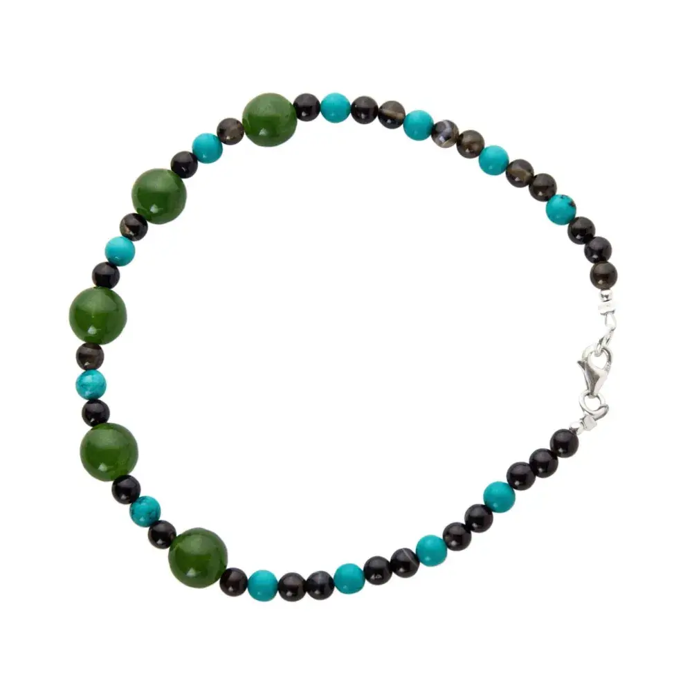 La combinación de la turquesa y el jade, consideradas de gran valor y muy requeridas como talismanes por culturas milenarias como la china y las mesoamericanas, aunadas al ónix, tipo de cuarzo que ofrece a la vista hermosas franjas de colores contrastados o intensos colores sólidos, hacen que en esta pulsera luzca el trío perfecto.