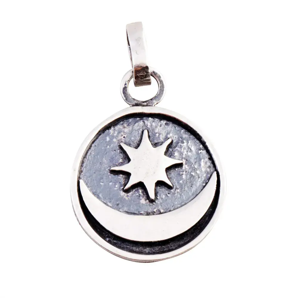 Dije Estrella y Luna Creciente, elaborado de manera artesanal en nuestro taller usando plata Sterling Ley 925.