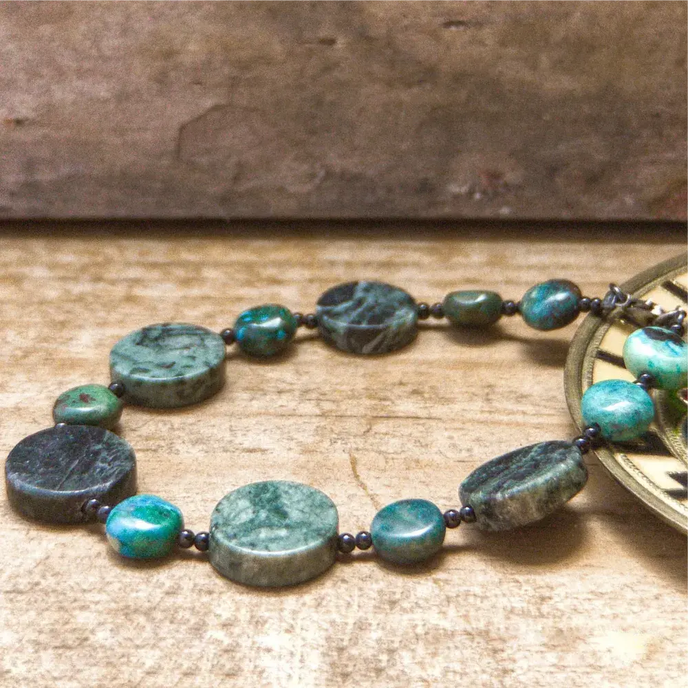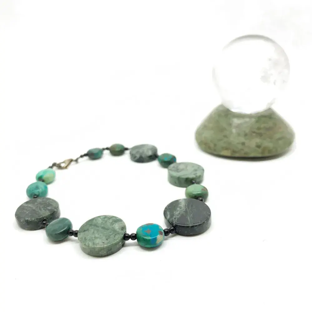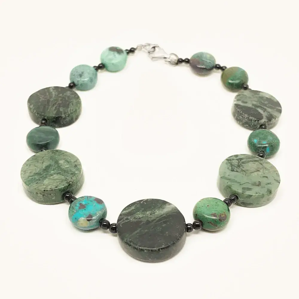Pulsera Discos de Jade con Turquesa y Ónix, elaborada de manera artesanal en nuestro taller. Las piedras naturales se montan con cuidado para que luzcan todo su esplendor.